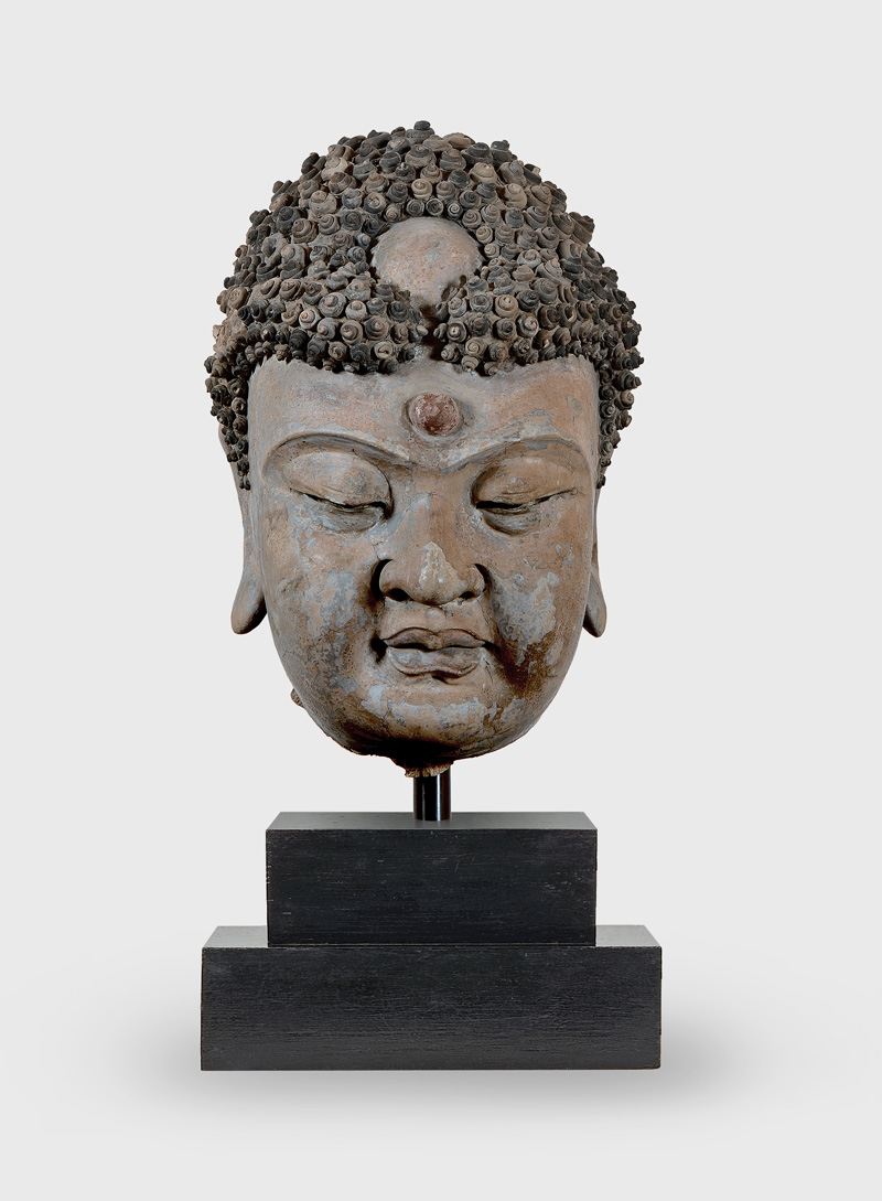 Dieser Kopf wurde in China im 6. Jahrhundert hergestellt. Der Kopf besteht aus Kalkstein und Fragmenten einer Höhlenfigur. Entlang der Seidenstraße wurden vom 2. bis 14. Jahrhundert für die Reisenden und Pilger zahlreiche in den Fels geschlagene buddhistische Figuren und Höhlentempel angelegt.