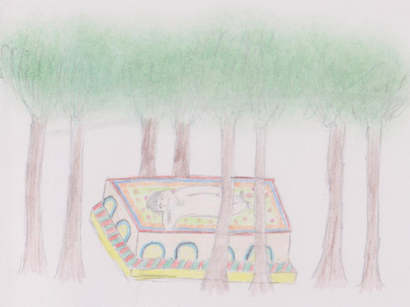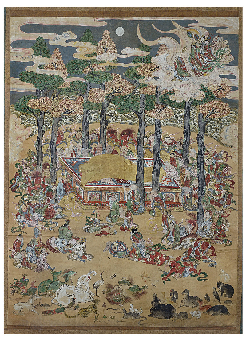 Das Bild zeigt den leiblichen Tod des Buddhas, der ihn in das vollkommene Nirwana (Nehan-Zu) führt. Dies ist im Buddhismus der ideale Zustand nach dem Tod. Die acht Sala-Bäume, die den Buddha umringen sind Flügelfruchtgewächse.