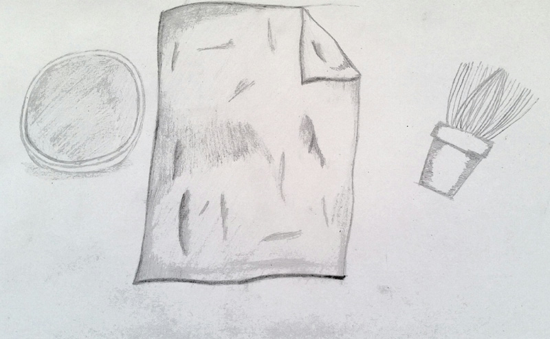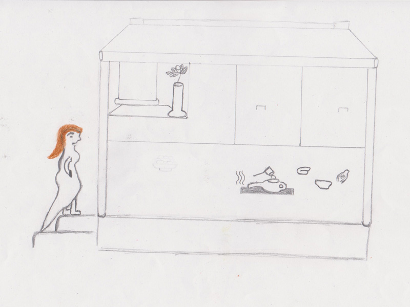 Die Teilnehmerin nimmt sich einen leckeren japanischen Keks. Während sich der Gast bedient geht die Teemeisterin raus und holt zwei Schüsseln, die sie für die Zubereitung des Matscha Tees braucht. Während die Teilnehmerin den Keks isst, gießt die Teemeisterin kaltes Wasser in den traditionellen Kessel, indem sich schon heißes Wasser befindet.