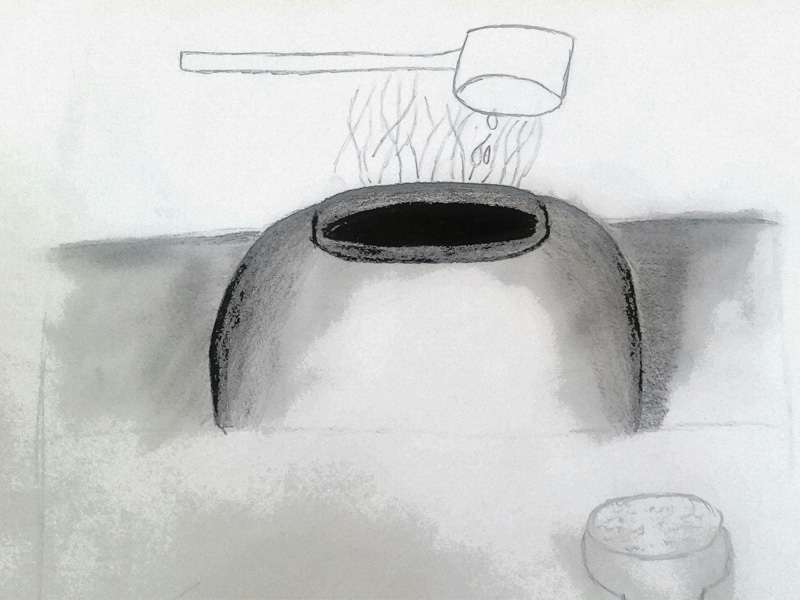 Während die Teilnehmerin der Teezeremonie die Treppe hinaufgeht, steht schon ein Kessel in der Mitte des Teehauses bereit. Das Wasser im Kessel kocht schon.