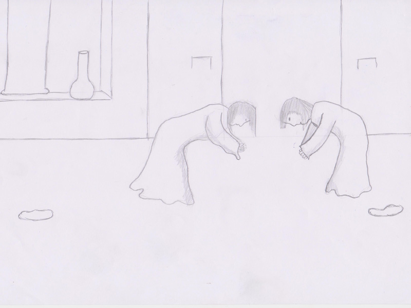 Während sich die Teilnehmerin in der Mitte des Teehauses hinkniet und auf die Teemeisterin wartet, kommt auch die Meisterin durch die Schiebetür. Die Teemeisterin hat einen Teller mit japanischen Süßigkeiten dabei und geht langsam in die Mitte des Teehauses. Sie kniet sich hin und stellt den Teller mit Keksen vor den Gast.