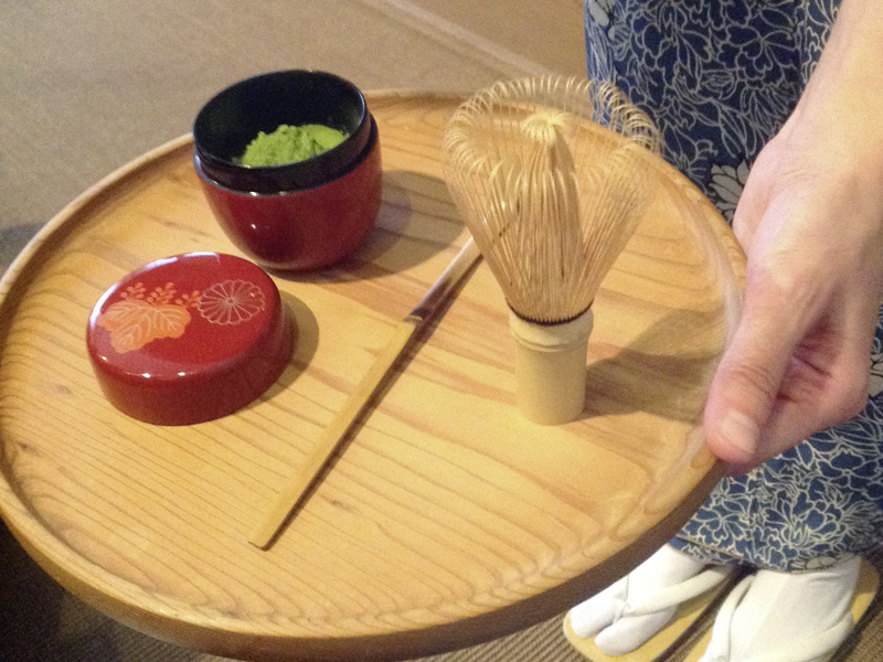 Wenn das Wasser abgekühlt ist, benutzt die Teemeisterin die Schöpfkelle und nimmt sich heißes Wasser aus dem Kessel, um es in die Schale zu gießen. Sie nimmt sich einen Bambusschneebesen und rührte damit in der Schale herum, in der sich der Matcha Tee befindet.